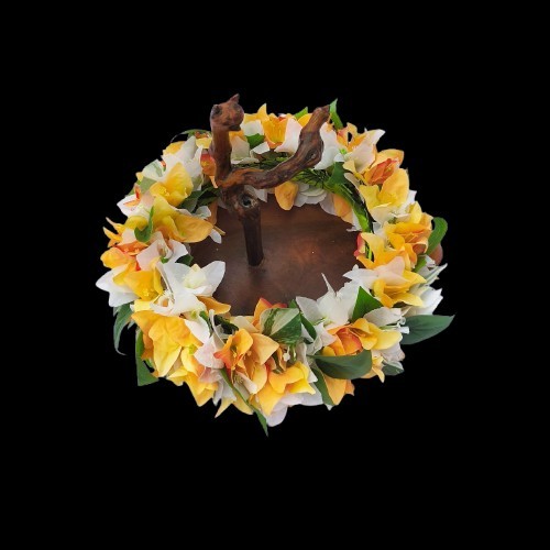 Description : Couronne modèle unique, confectionnée avec des fleurs et feuillages artificielles, douce et légère a portée.