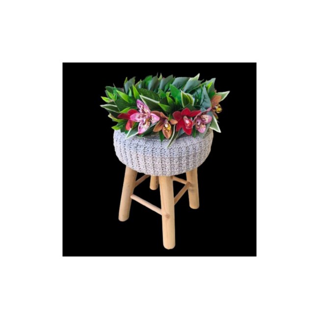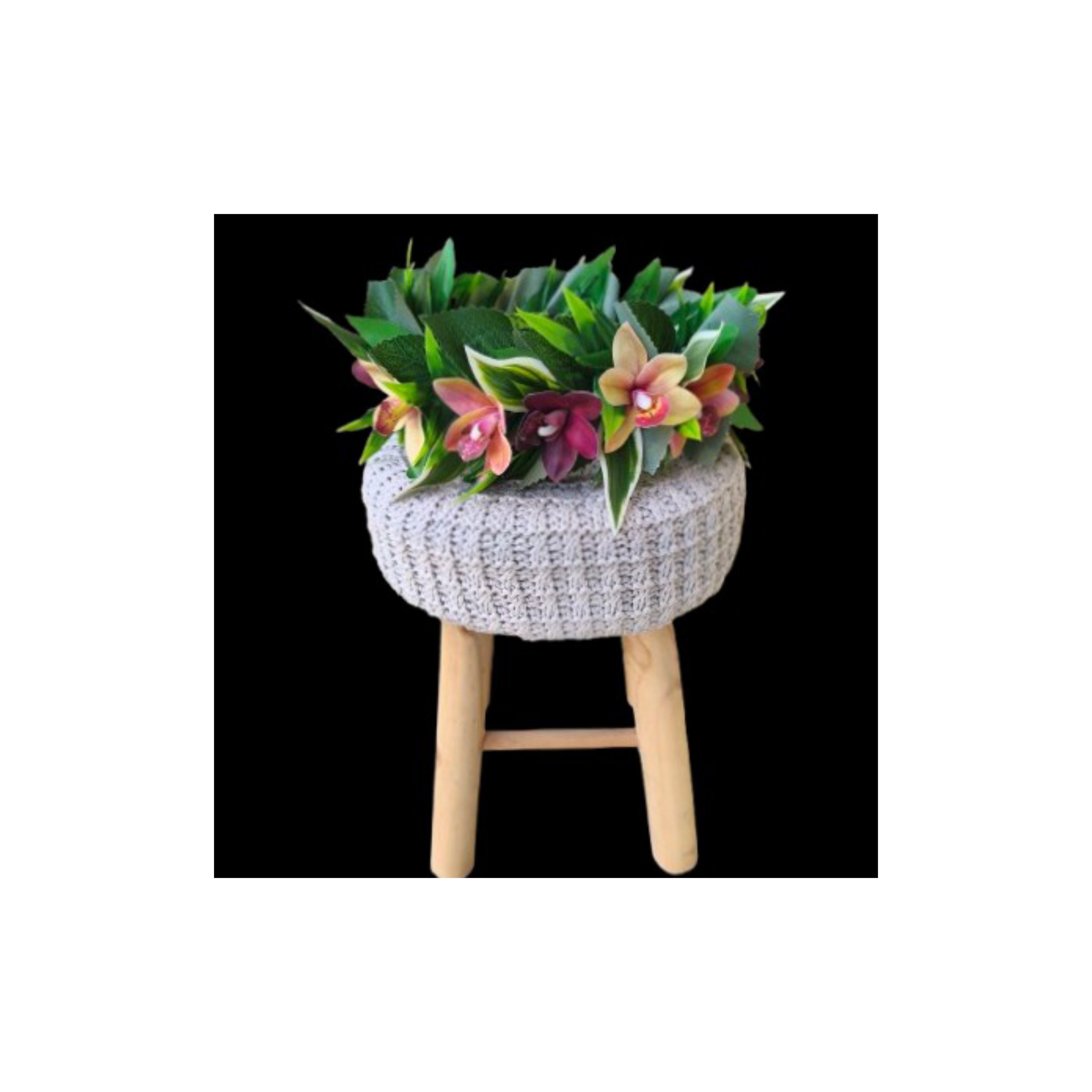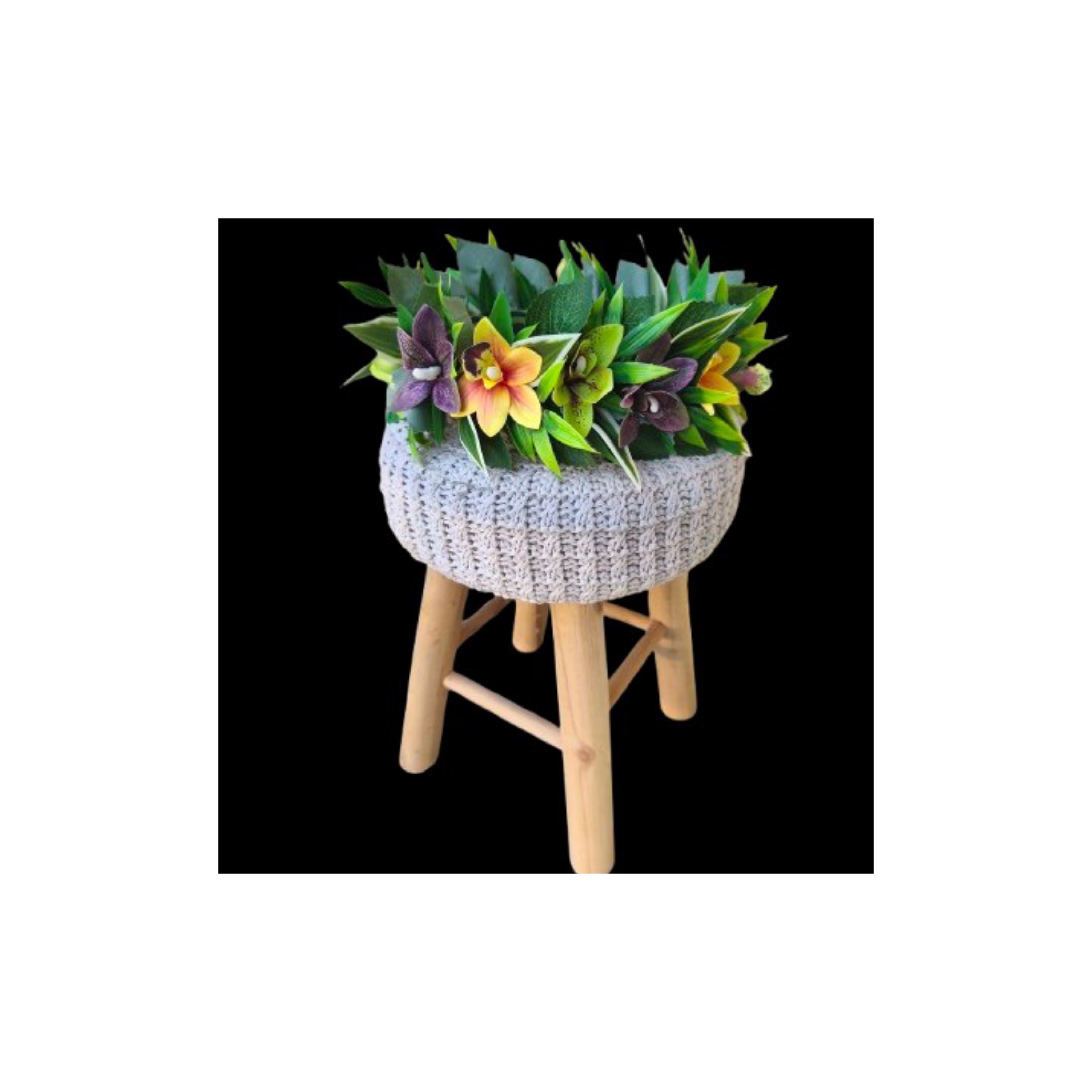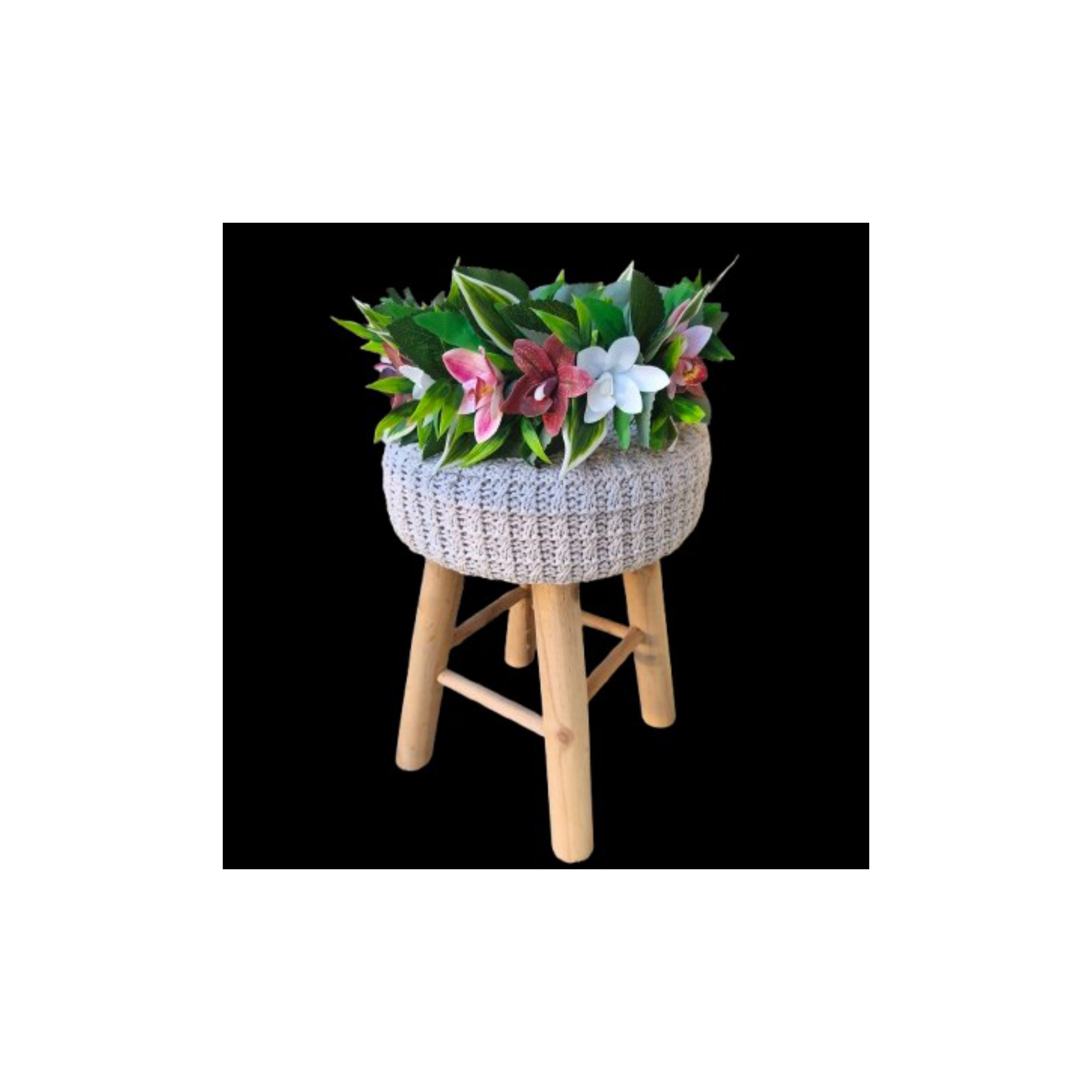 Composition : Fleurs, feuilles, bande de tissu, bolduc et velcro.