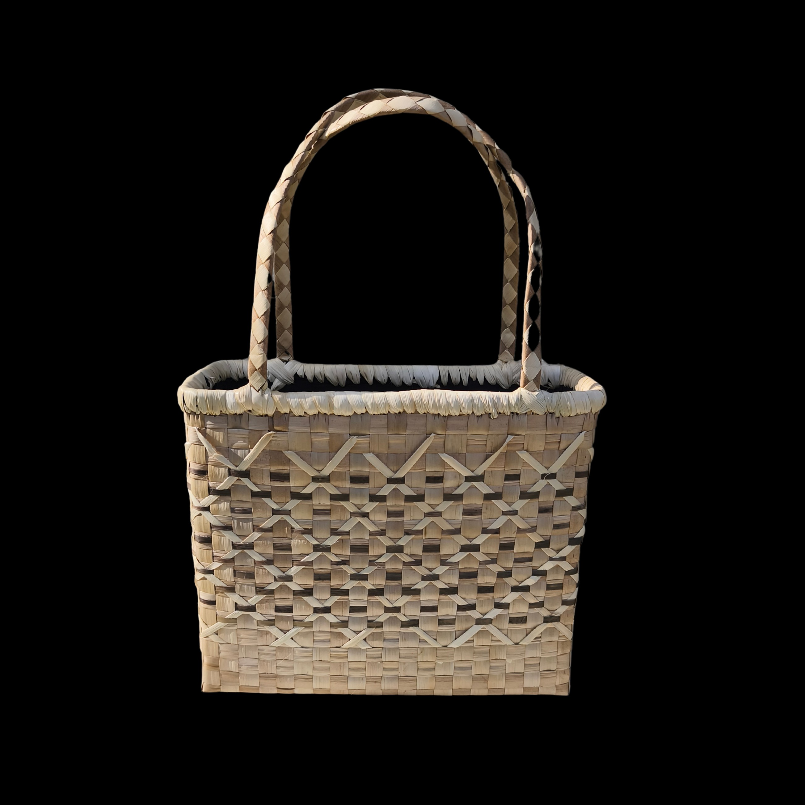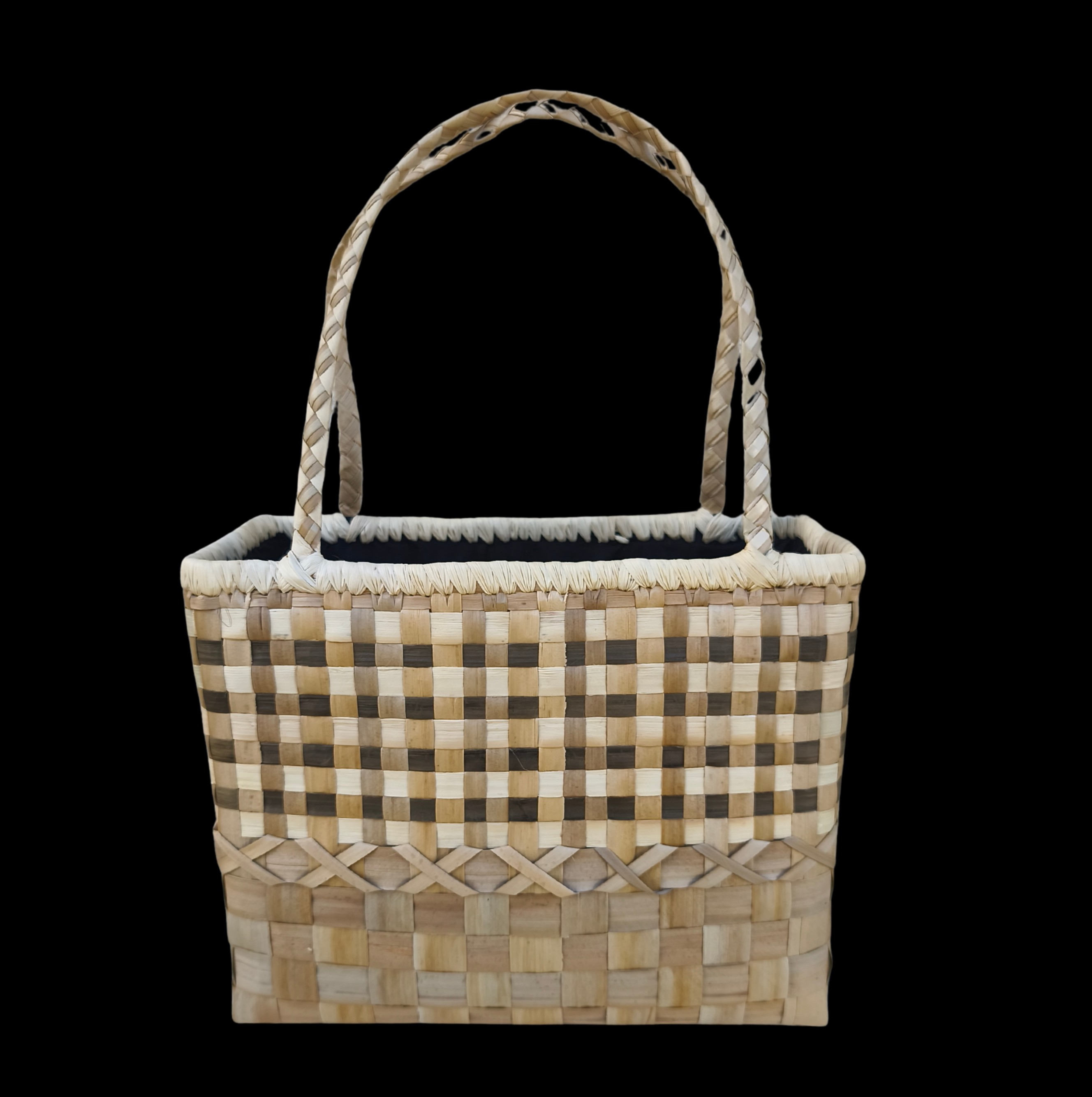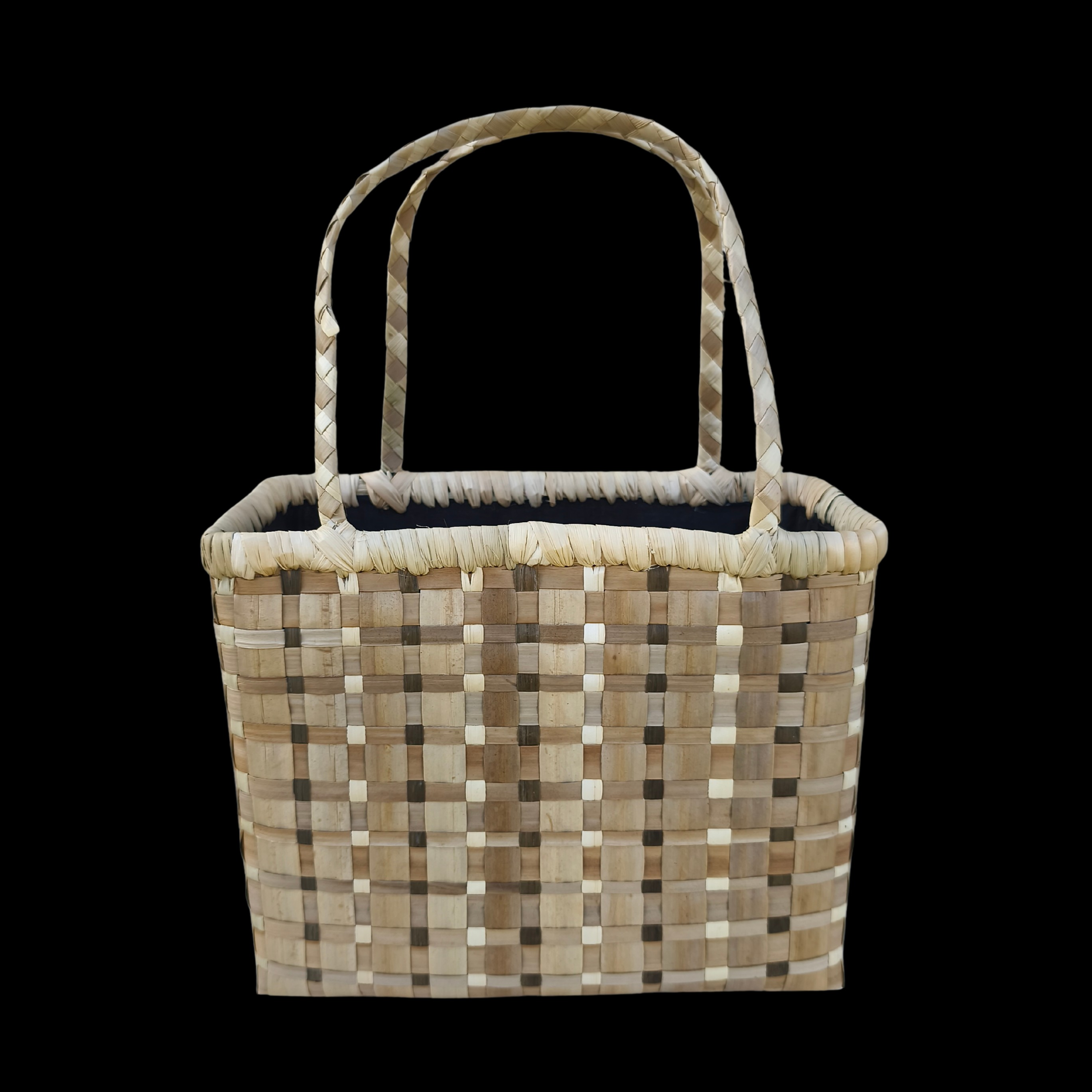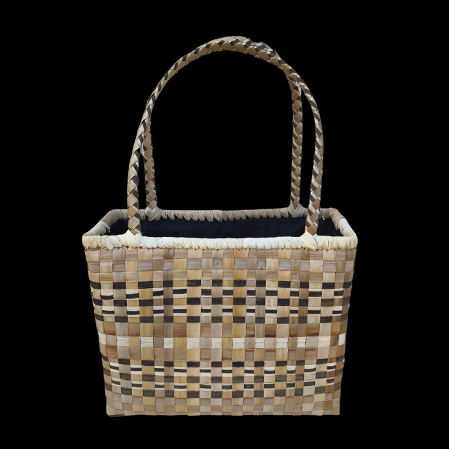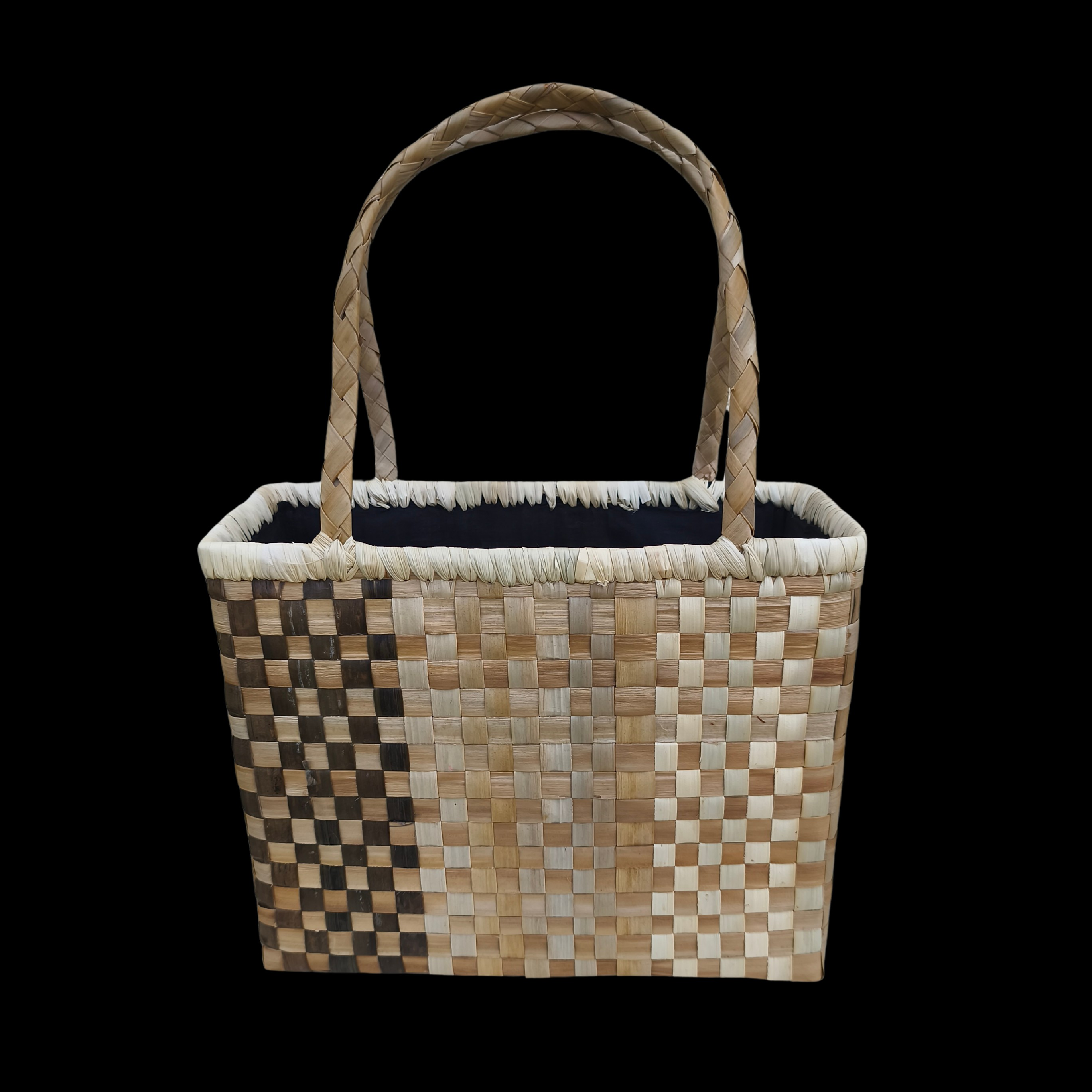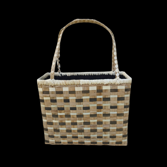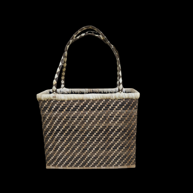 Description : Panier local typiquement Polynésienne sans couvercle avec 2 anses et recouvert de tissu noir à l'intérieur, fabriquer artisanalement à la main, c'est un modèle unique, il pourra très bien vous servir de sac à main.