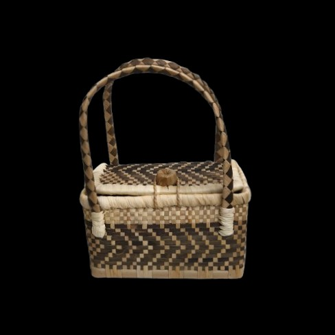 Description : Petit panier en pandanus tréssé avec des petites mains de fée, composé de deux anses avec couvercle et recouvert de tissu noir à l'intérieur.