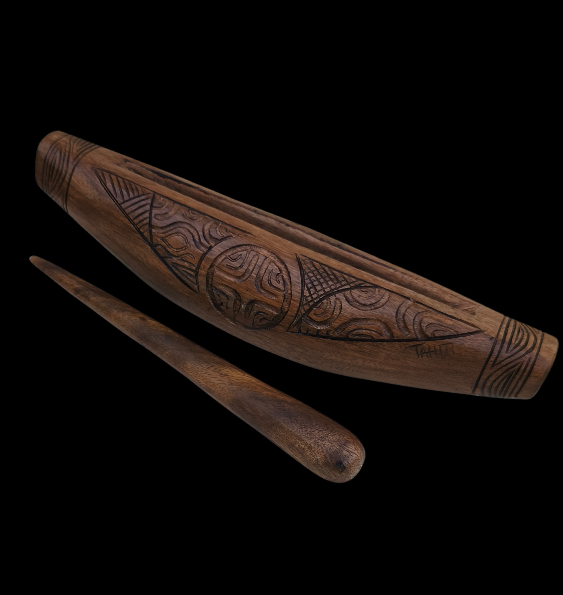 Description : Le To'ére est un morceau de bois présentant une fente dans le sens de la longueur et gravé avec des motifs marquisiens, utilisé souvent en Polynésie comme intrument de musique à percusion.